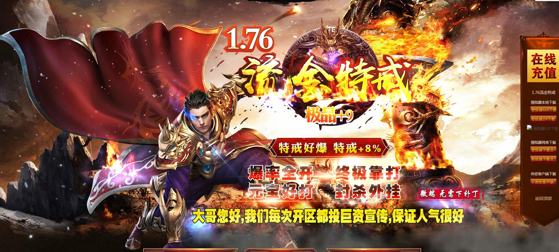 | New~《1.76极品特戒+9版》独家版本-实力研发-流金品牌大服保障 2019-08-12【版本介绍】2019新版独家制作,装备好爆,元宝好打! 2019-08-12【充值比例】元宝比例 1:1500 微信、支付宝多送100%! 2019-08-12【开区介绍】每天开放4个新区,测试区提前1个小时开放! 2019-08-12【新区活动】每天活动不停,各种福利送送,也有活动必爆特戒! 2019-08-12【装备爆率】本服所有装备靠爆,包括充值也爆,一切看脸! 2019-08-12【职业介绍】三职业平衡,道士开荒不累,法师也有5只宝宝! 2019-08-12【本服忠言】请不要贪图小便宜,私下交易被骗自负!