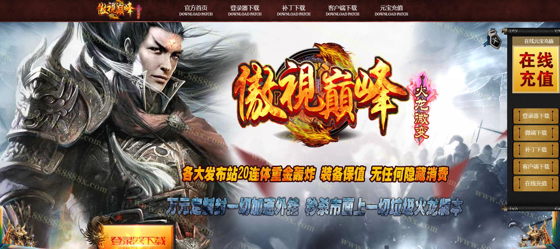 | 【元宝比例】 1:5000 点卡,微信,支付宝,信用卡等等赠送100% 【测试区充值,开区后返还,额外多赠送30%】 【回收提现】 本服现金回收终极首饰50元,衣服武器200元,特殊以及其他装备等,详情看游戏上面 【管理心声】 合区后回收价格不变,虽然回收价格一般,但本服爆率是真实爆率,散人打金轻松赚钱,只为玩家玩的愉快 【开区公告】 每日开6个新区 区区准时开放 详情看登陆器 区区重金广告推广 人气火爆 激情无限... 【首沙奖励】 新区开放第二天合区,第三天统一拿沙奖励300元RMB 激情无限 百人拿沙 公司长期稳定运营 【特色特殊】 特殊:血石,符文,斗笠,盾牌,可越级战斗,(本服有套装属性,斗笠爆击尤其重要) 【装备看脸】 哪怕新手地图,也有一定几率暴出好的装备或者材料,拼人品的时候到了,绝对不忽悠 【拒绝顶药】 现在顶药外挂猖獗,本服无任何药品,回血全靠血石(上线免费送),PK靠技术 【封杀外挂】 本服使用万元定制版云端封挂登陆器,封杀一切加速,脱机外挂,还原绿色游戏 【游戏介绍】 本服为纯散人打造,耗时半年打造,进服体验,打金首选,半年不用在找服了!!!