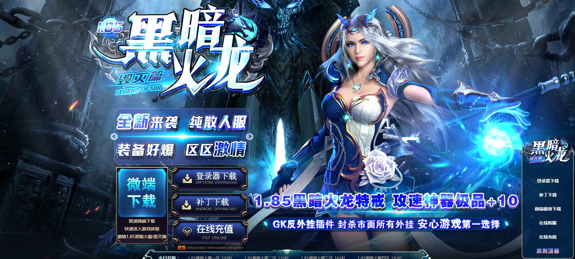 | 黑暗特戒第二章·1.85黑暗火龍毁灭篇 【版本介绍】2020年最新“1.85黑暗火龍·毁灭篇”黑暗再次来袭! 【充值比例】比例:1:2000+10个龍币,网银多送100%的元宝! 【开区介绍】每天开放4个新区,测试区提前1个小时开放! 【装备爆率】本服所有装备靠爆,包括充值也爆,一切看脸! 【职业介绍】三职业平衡,道士开荒不累,法师也有5只宝宝! 【沙城奖励】攻沙奖励大量元宝和充值,失败方也有奖励领取! 【本服忠言】请不要贪图小便宜,私下交易被骗自负!担保找客服! 【严重警告】请勿开任何辅助外挂,一旦发现直接删号!无需理由!