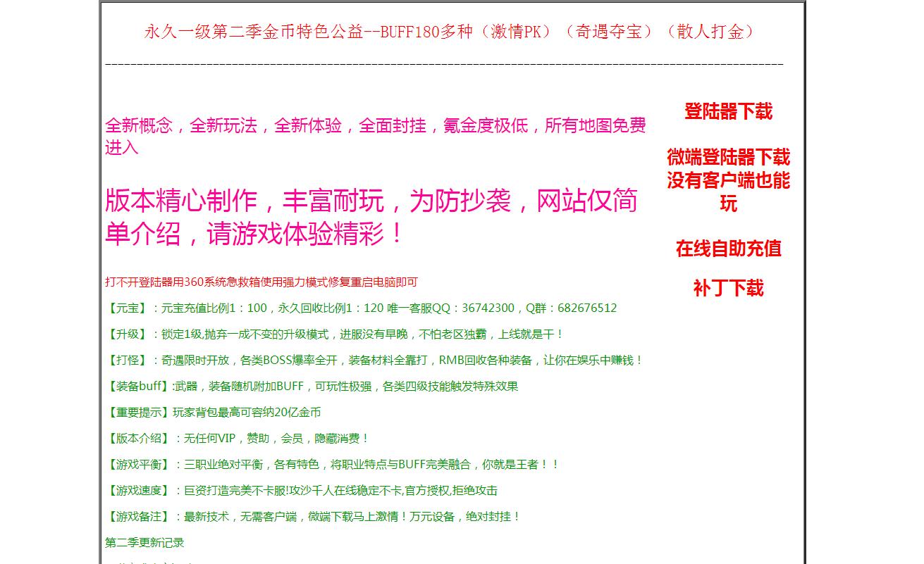 | 永久一级第二季金币特色公益--BUFF180多种(激情PK)(奇遇夺宝)(散人打金) 全新概念,全新玩法,全新体验,全面封挂,氪金度极低,所有地图免费进入 版本精心制作,丰富耐玩,为防抄袭,网站仅简单介绍,请游戏体验精彩! 打不开登陆器用360系统急救箱使用强力模式修复重启电脑即可 【元宝】:元宝充值比例1:100,永久回收比例1:120 唯一客服QQ:36742300,Q群:682676512 【升级】:锁定1级,抛弃一成不变的升级模式,进服没有早晚,不怕老区独霸,上线就是干! 【打怪】:奇遇限时开放,各类BOSS爆率全开,装备材料全靠打,RMB回收各种装备,让你在娱乐中赚钱! 【装备buff】:武器,装备随机附加BUFF,可玩性极强,各类四级技能触发特殊效果 【重要提示】玩家背包最高可容纳20亿金币 【版本介绍】:无任何VIP,赞助,会员,隐藏消费! 【游戏平衡】:三职业绝对平衡,各有特色,将职业特点与BUFF完美融合,你就是王者!! 【游戏速度】:巨资打造完美不卡服!攻沙千人在线稳定不卡,官方授权,拒绝攻击 【游戏备注】:最新技术,无需客户端,微端下载马上激情!万元设备,绝对封挂! 第二季更新记录 1.附魔成功率提升 2.增加新装备,新地图 3.元宝激活账号赠送神器 4.调整和优化BUFF,超多BUFF,任意搭配,其乐无穷 5.道士随着道术增加,可召唤不同宝宝,神宠在手,天下你有! 6.战士,法师大幅度加强,攻击带毒,还能触发神秘宝宝,三职业绝对平衡! 7.大量更新,更多精彩内容请在游戏内体验