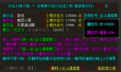 在斗罗传奇私服中最简单有效的分辨人物强弱的方法就是比较游戏中人物的攻击,攻击高的玩家不说是100%能够打赢,起码赢的几率在70%,而且游戏中还有攻击的排行榜供大家膜拜,那么今天就和大家来说说游戏中的攻击排行榜。![]() 在斗罗传奇中全服攻击力前三的玩家才能够上这个榜单,在榜单上的玩家能够获得生命属性以及打宝爆率属性的加成,加成虽少但是爆率还是相当不错的一个属性,而且未上榜的玩家是能够朝拜榜上玩家的,每次朝拜需要消耗玩家100万的元宝,朝拜完成之后能够获得“朝拜者”这个称号,称号能够提升10%的爆率加成,3000点切割伤害以及1000点血上限的提升,获得属性还是相当可以的,而且榜上的玩家每次接受来自其他玩家的朝拜之后能够获得5000点伤害加成以及0.2倍的攻击属性加成,最多能够叠加10次这个属性,满次之后就是50000点的伤害以及2倍的攻击了,这个BUFF每天刷新,所以我们可以在城战的时候开启这个BUFF。 以上就是斗罗传奇攻击排行的介绍,想要人物变得厉害就要去提升攻击属性。 |
