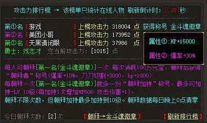 在斗罗传奇私服中最简单有效的分辨人物强弱的方法就是比较游戏中人物的攻击,攻击高的玩家不说是100%能够打赢,起码赢的几率在70%,而且游戏中还有攻击的排行榜供大家膜拜,那么今天就和大家来说说游戏中的攻击排行榜。![]() 在斗罗传奇中全服攻击力前三的玩家才能够上这个榜单,在榜单上的玩家能够获得生命属性以及打宝爆率属性的加成,加成虽少但是爆率还是相当不错的一个属性,而且未上榜的玩家是能够朝拜榜上玩家的,每次朝拜需要消耗玩家100万的元宝,朝拜完成之后能够获得“朝拜者”这个称号,称号能够提升10%的爆率加成,3000点切割伤害以及1000点血上限的提升,获得属性还是相当可以的,而且榜上的玩家每次接受来自其他玩家的朝拜之后能够获得5000点伤害加成以及0.2倍的攻击属性加成,最多能够叠加10次这个属性,满次之后就是50000点的伤害以及2倍的攻击了,这个BUFF每天刷新,所以我们可以在城战的时候开启这个BUFF。 |